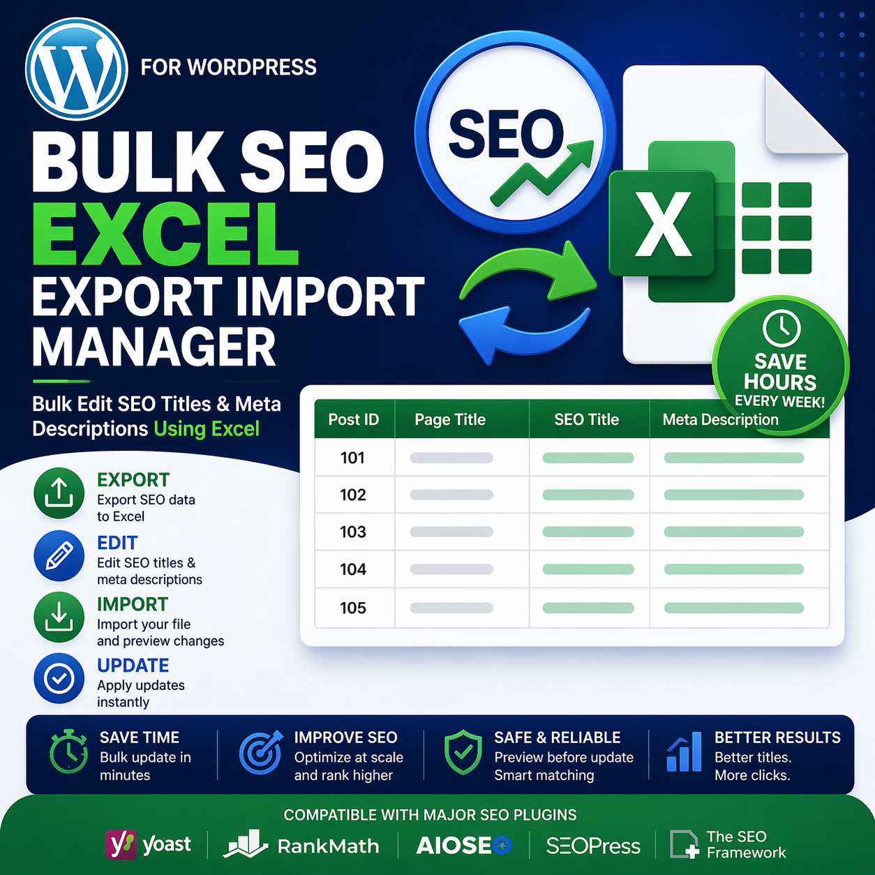 Bulk SEO Excel Export Import Manager is a powerful WordPress plugin designed to simplify large-scale SEO management. Instead of editing pages one by one, this tool allows you to export your content into a spreadsheet, update SEO titles and meta descriptions in Excel, and import the changes back into your site in seconds.
